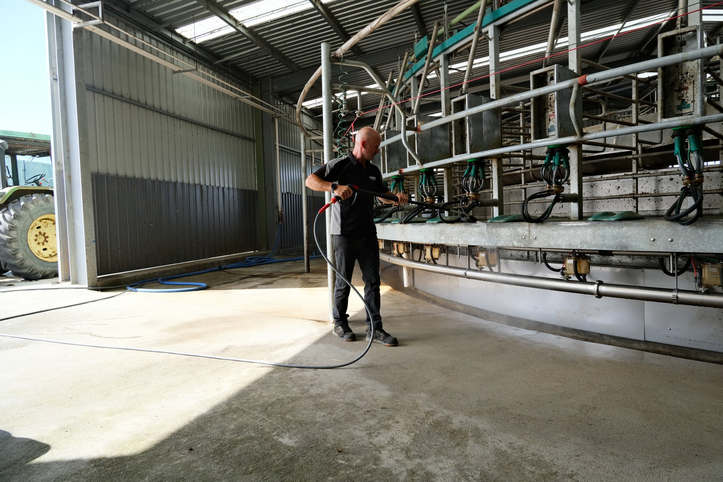 Lavorwash products cut through tough grease and build-up on dairy farms by combining powerful, Italian-engineered cleaning technology with purpose-built detergents and durable components. High-pressure washers and industrial floor scrubbers deliver targeted force and consistent flow to dislodge from hard surfaces. Specialized nozzles and adjustable pressure settings allow operators to match cleaning intensity to the job, minimizing water and chemical use while protecting equipment and surfaces. The result is faster, more efficient cleaning cycles, reduced labour, and improved hygiene—helping industrial and commercial operators like this dairy farm to maintain cleanliness standards with less effort and greater confidence.