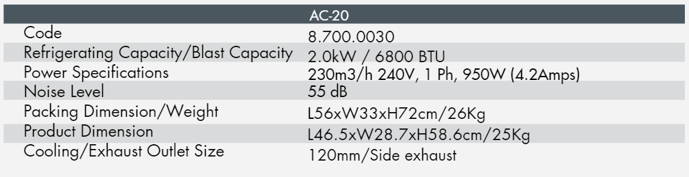 The AC20 has a refrigerating capacity of 2.0kW while running on 240V power with a max power input of only 3.2Amps. A noise level of only 55dB means this does not impact on noise levels in small areas. Weighing in at only 26Kg it makes it the perfect portable unit to be moved around and used where necessary.
