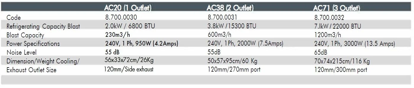 The AC20 has a refrigerating capacity of 2.0kW while running on 240V power with a max power input of only 3.2Amps. A noise level of only 55dB means this does not impact on noise levels in small areas. Weighing in at only 26Kg it makes it the perfect portable unit to be moved around and used where necessary.
