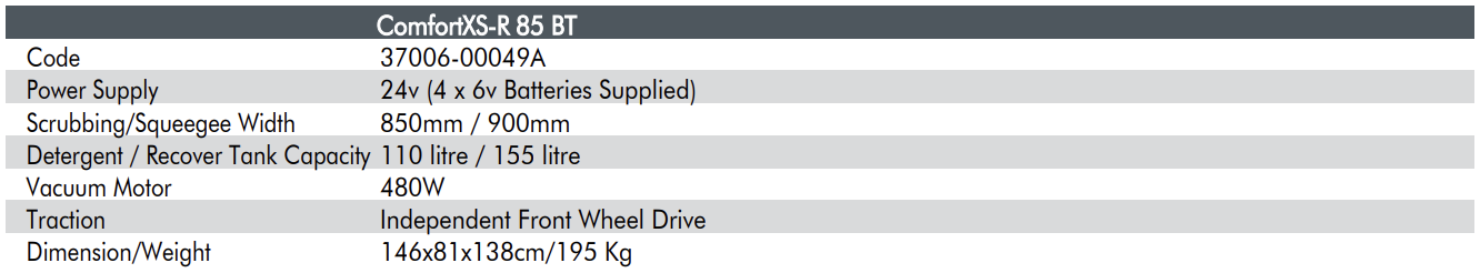 The COMFORT85RUP scrubber dryer is capable of deep cleaning large areas (up to 4,000 m²) with a considerable reduction of cleaning costs. This is as a result of the 850MM twin brush coverage and 900MM squeegee coverage.