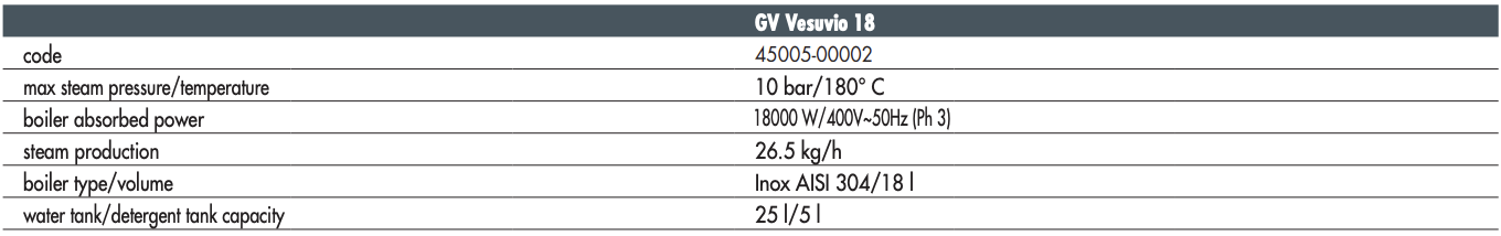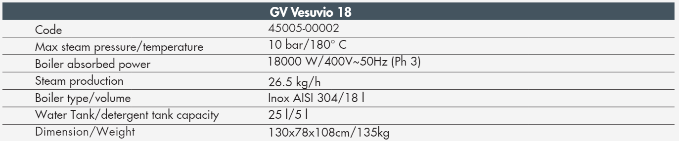 The GV Vesuvio 18 is a fully electric 3 phase industrial steam cleaner, producing 180c steam at 150PSI of pressure. The machine includes an onboard 25 litre water tank and 5 litre chemical tank, although the machine can be plugged in to water for continuous use.