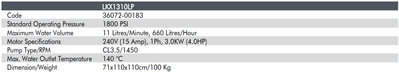 The LKX1310LP hot water pressure washer is an industrial quality machine. This pressure washer comes with a large 3000W induction 240V motor which delivers 11 litres of water per minute at an operating pressure of 1800 PSI.