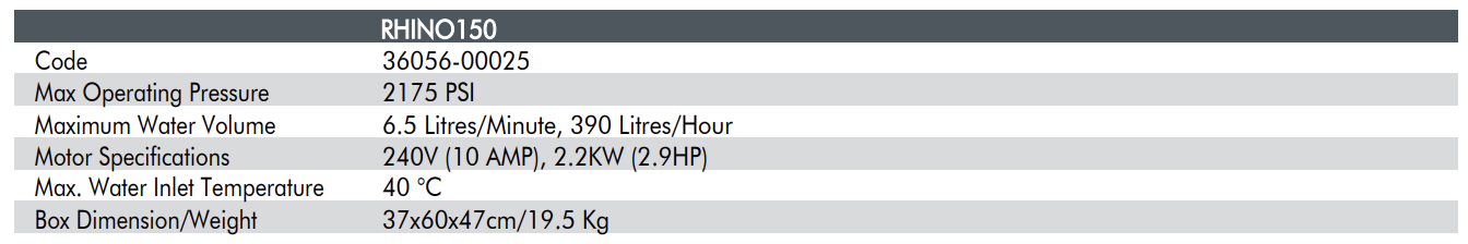 The Lavor RHINO150 high pressure washer is a low duty, domestic cold water machine. With a low maintenance brushless 2.2kW motor, this machine has a very good delivery of 2175 PSI at 6.5 litres per minute. The pressure washer comes standard with Auto Stop which shuts off the motor when not in use.