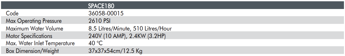 The Lavor SPACE180 high pressure cleaner is a medium duty, Domestic grade cold water machine. The machine has a 2.4KW universal 240V electric brush motor that offers the home user a Domestic grade machine with plenty of grunt with 8.5LPM at a maximum pump pressure of 2610PSI. Most importantly, the carbon brush universal motor is fitted with a thermal overload. As a result, this protects the motor from damage when used for longer than the suggested continuous use periods.