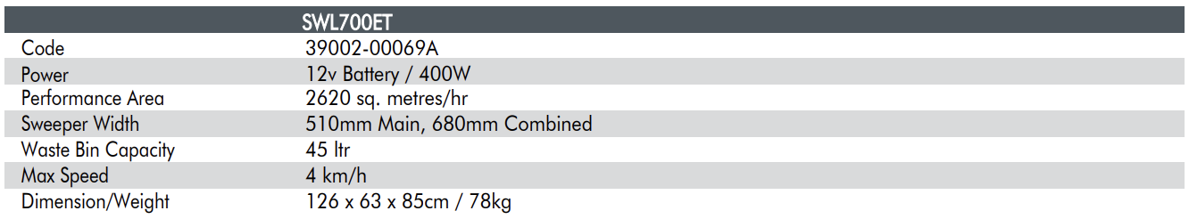 The SWL700ET SWEEPER is a battery powered vacuum sweeper unit which is ideal for large heavy traffic areas with dry dust or dirt needing to be picked up. The unit is a sweeper which sweeps within the bottom skirt of the unit and the vacuum then collects all the airborne dust within the skirt perimeters and expels the air out through a large cartridge filter which collects the dust.