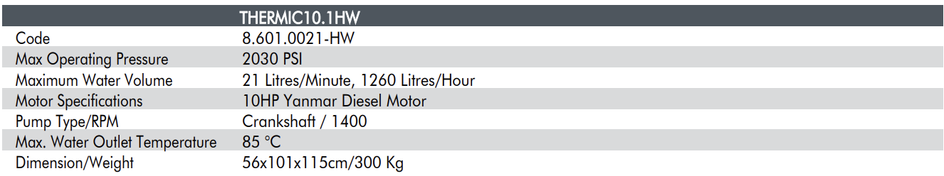 The Thermic 10.1HW is a Diesel Powered, portable unit delivering 85c of water at 2320psi with a flow rate of a staggering 21 litres a minute. For serious hot water delivery in a mobile machine, you can’t get better than this.