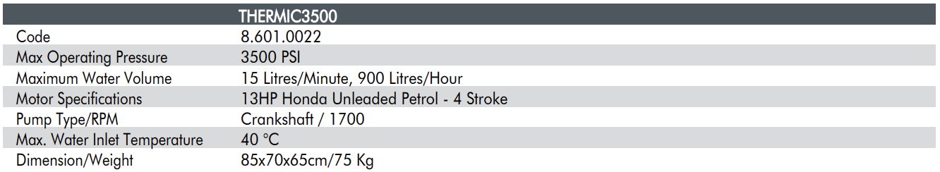The Thermic3500 is a petrol pressure washer delivering 3500 psi at 15 litres per minute flow rate. A 13 HP GX390 Honda motor makes this washer ideal for long period use, with its 2:1 reduction gearbox between the motor and pump. Because of these features, this machine is built for very tough applications.