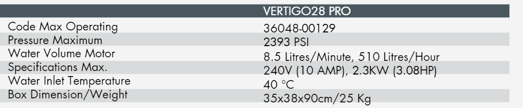 The Vertigo28 Pressure Washer has 2.4KW induction electric 240V motor which delivers a maximum 8.5 litres of water per minute. The pressure cleaner also has a maximum pump pressure of 2393 PSI. It is the perfect product even for the most demanding customers reliable and powerful, it is equipped with an induction motor and a brass head, accessories and offers top performances to face any outdoor cleaning need.