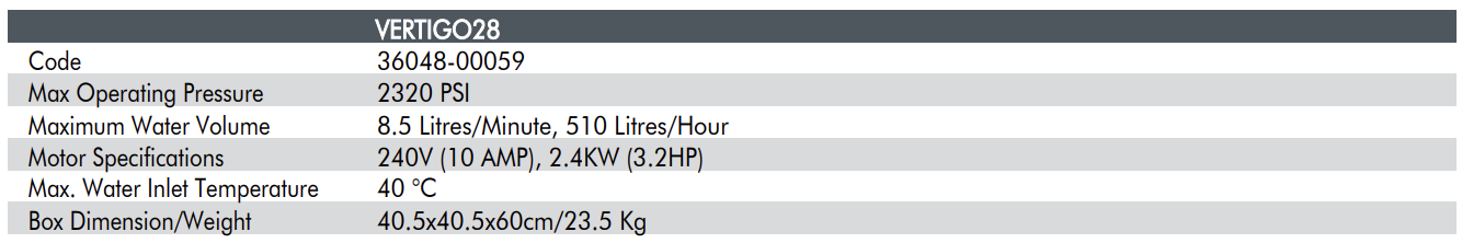 The Vertigo28 Pressure Washer has 2.4KW induction electric 240V motor which delivers a maximum 8.5 litres of water per minute. The pressure cleaner also has a maximum pump pressure of 2320 PSI. Three steel pistons, anodized pump head with built-in by-pass valve. Automatic stop system. Built-in detergent tank for direct suction. Hose reel. Side holder to site lance and gun matched together (ready for use). Trolley with ergonomic handle, granting excellent mobility. Gun with quick connection. Lance with quick connection nozzles (set of 4 nozzles included). TURBO nozzle. Fixed and rotary brush.