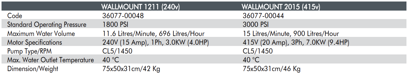 The Lavor Wallmount1211 machine is one of two Professional wall mount pressure washer units presently offered in our “Elite” Lavor HYPER range of machines. This single phase 240V machine offers a flow rate of 11.6LPM at an operating pressure of anything up to 1800PSI. In addition, it is powered by a four pole, low revving electric motor.